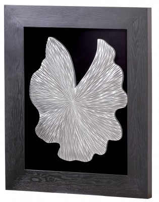 Панно "Медуза 1" — это настенное панно из фрезерованного МДФ в раме из шпонированного МДФ под стеклом. Цвет рамы черный с текстурой дерева, цвет панно - серебристый металлик. Подложка выполнена из фанеры обтянутой черным холстом.